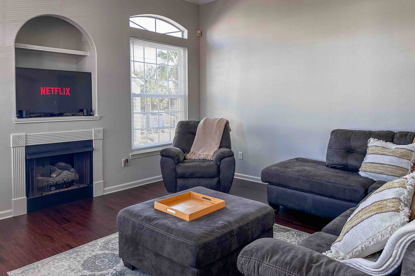 Guests will have exclusive and private access to the entire condo unit. Enjoy a seamless arrival with our easy self check-in process. Your stay includes full access to the fantastic community amenities: Two sparkling swimming pools Two relaxing hot tubs On-site fitness center/gym Community playground Scenic pond with a gazebo Parking is available for up to two vehicles, which includes one dedicated garage space and additional first-come, first-served street parking.