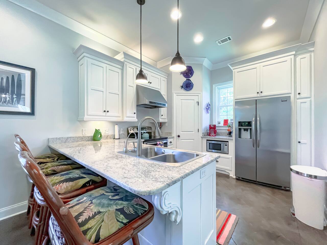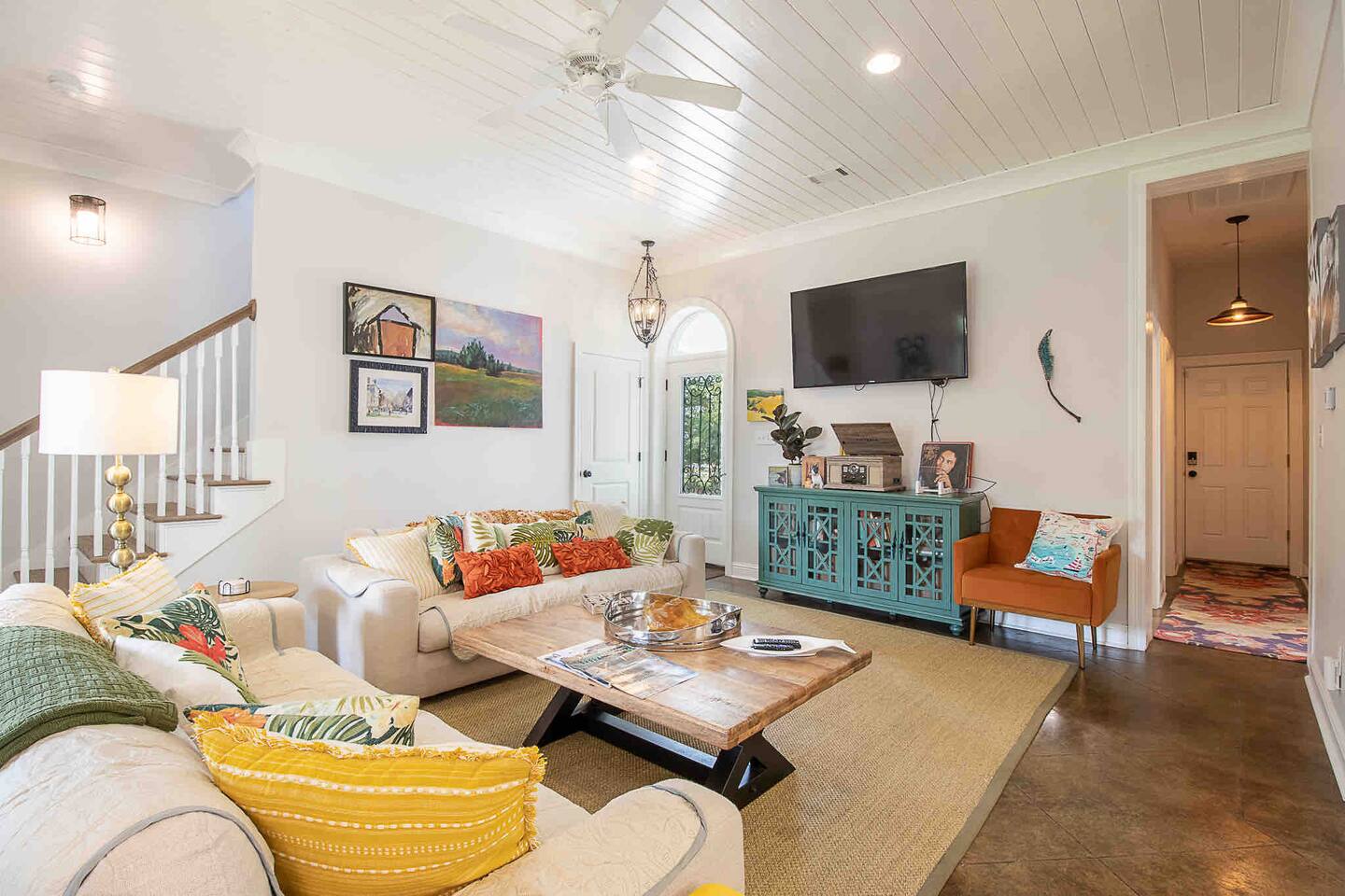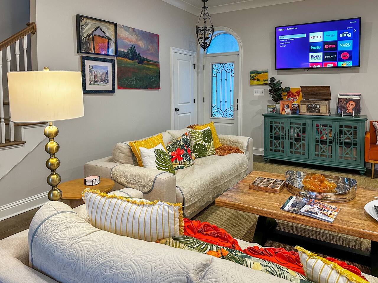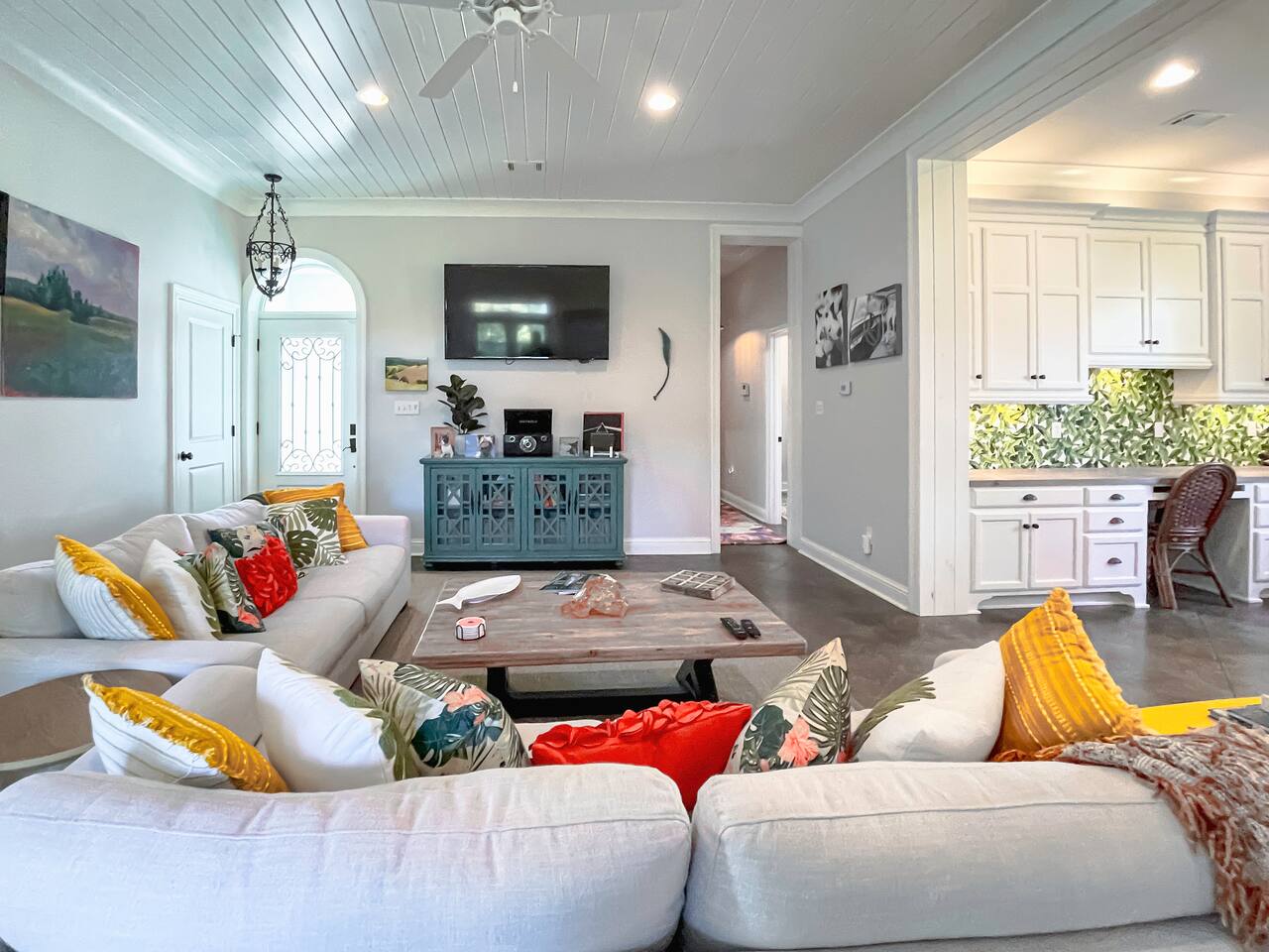 This home is very spacious, plenty of seating throughout, and boasts color and radiance throughout. Carefully thought out. Fully equipped kitchen. Large bedrooms, and living room. Plenty of outdoor seating upstairs and down.