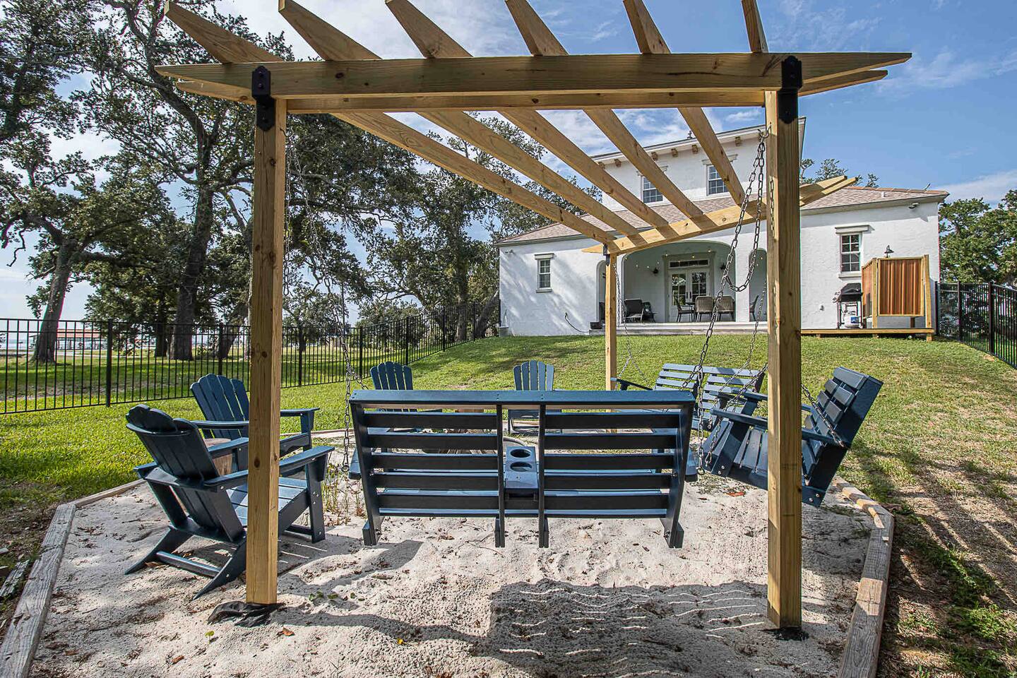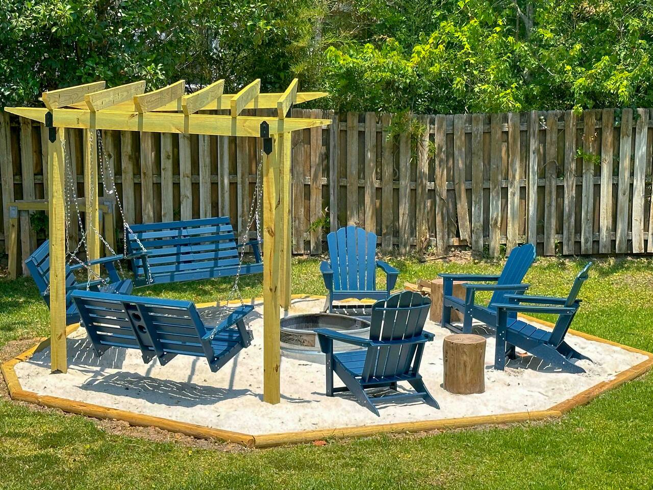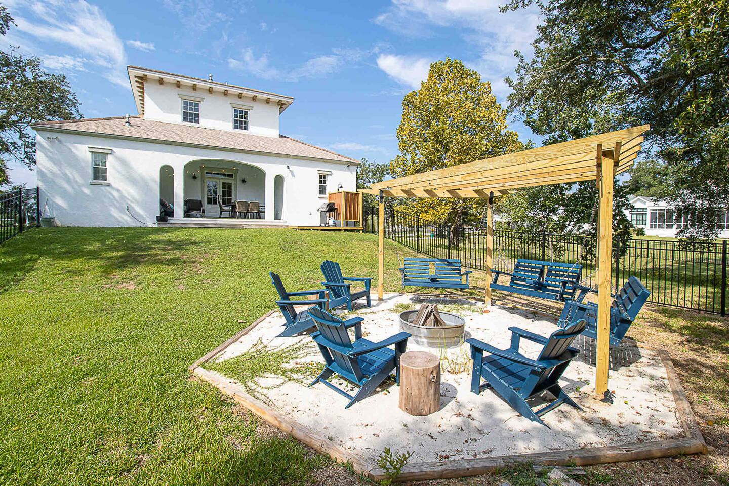 Immerse in Meditteranean bliss steps from the beach! Luxe outdoor oasis awaits - bonfire, porch swings, grill & patio dining under the stars. ✨Indulge in 2 king master suites w/jet tub & spa shower (handicap accessible!), plus bunk beds for the kids. Stream your faves in every room. Fast Wi-Fi, garage & space for pets! Your beach retreat awaits!