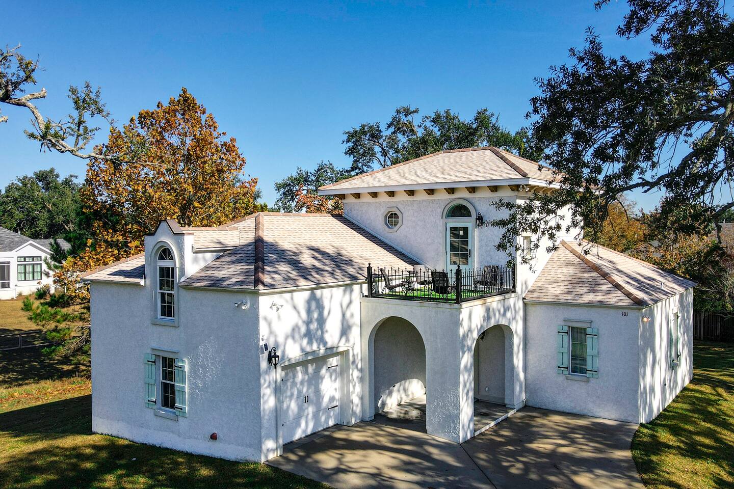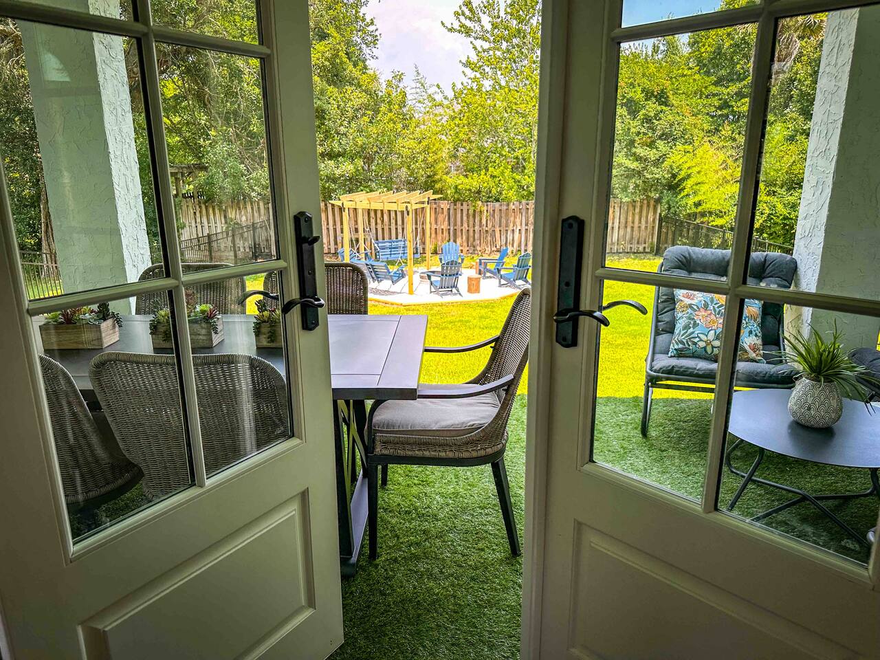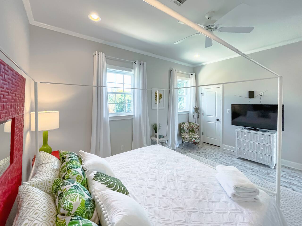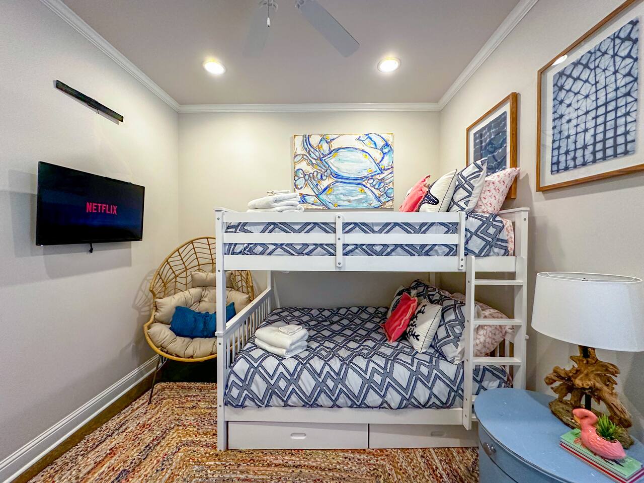 Immerse in Meditteranean bliss steps from the beach! Luxe outdoor oasis awaits - bonfire, porch swings, grill & patio dining under the stars. ✨Indulge in 2 king master suites w/jet tub & spa shower (handicap accessible!), plus bunk beds for the kids. Stream your faves in every room. Fast Wi-Fi, garage & space for pets! Your beach retreat awaits!