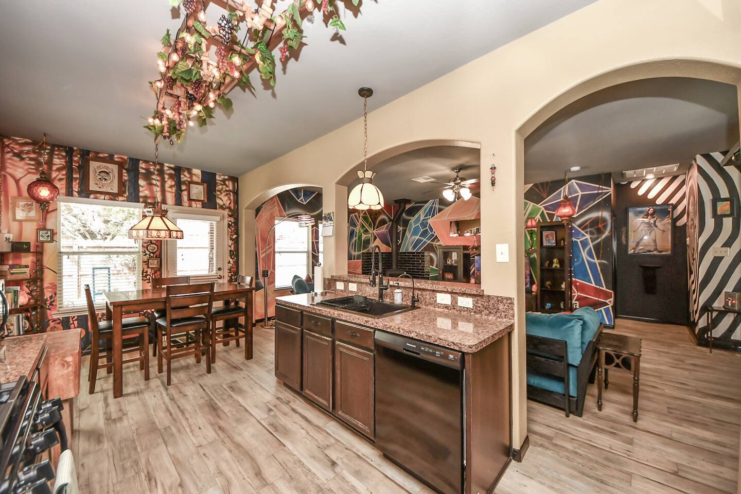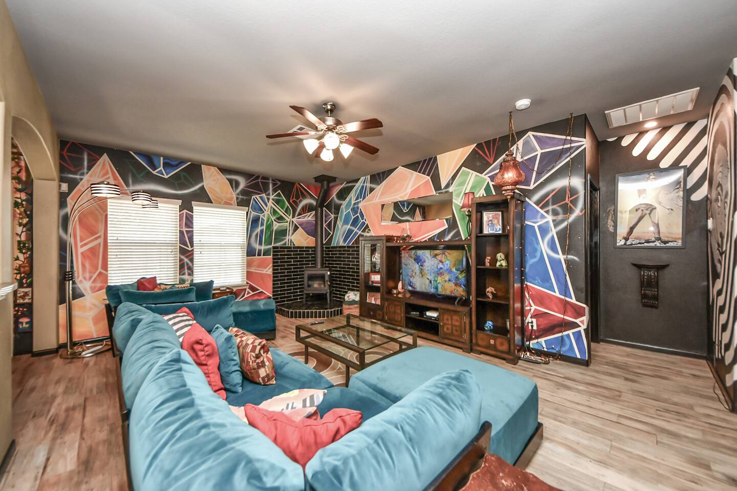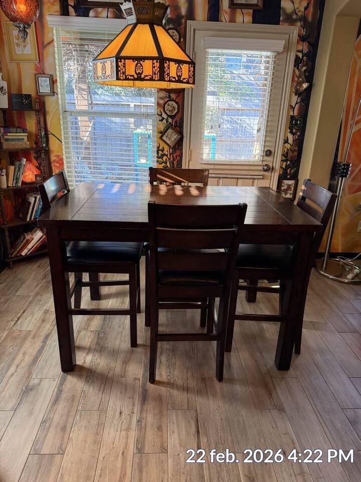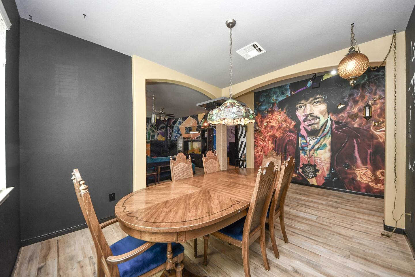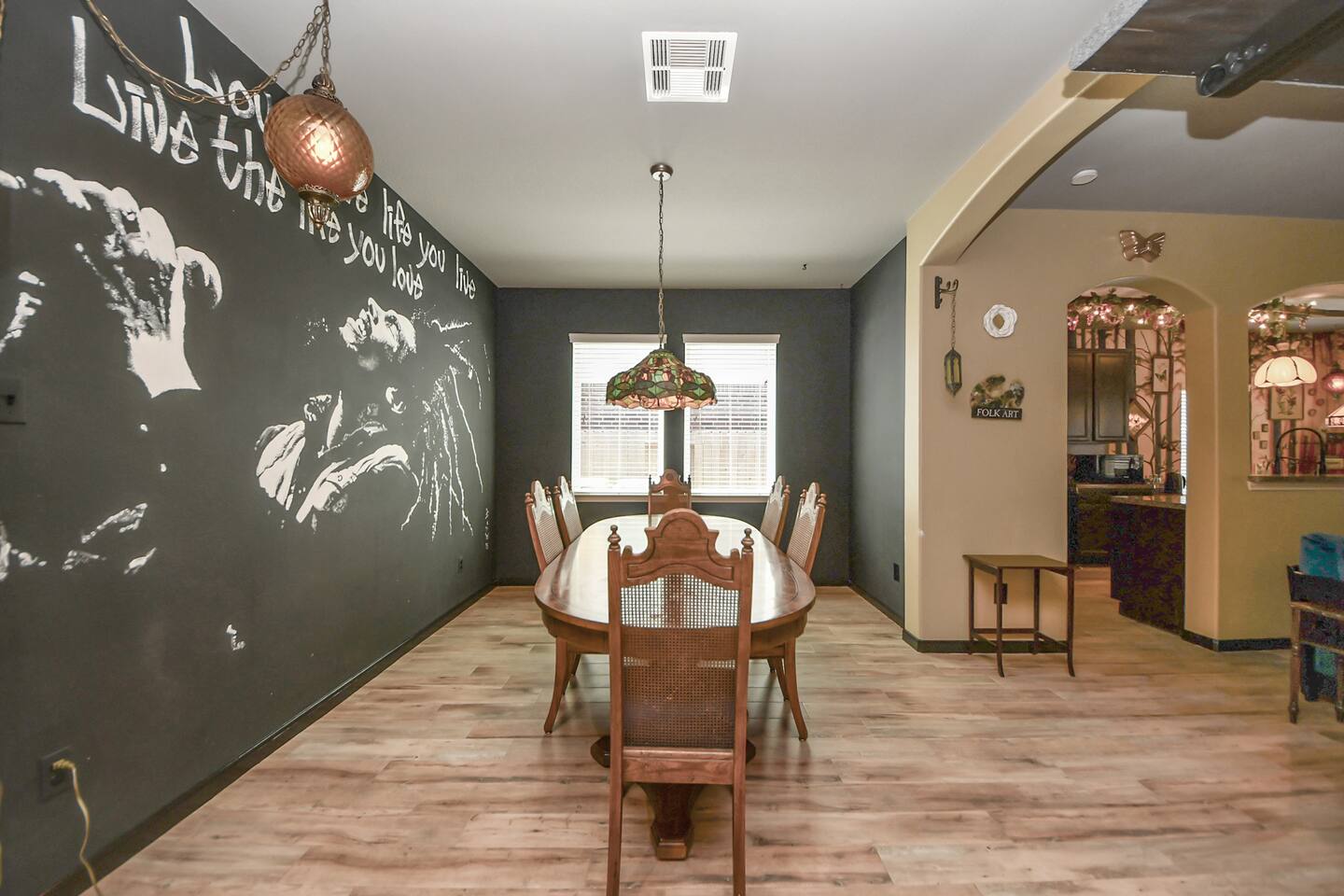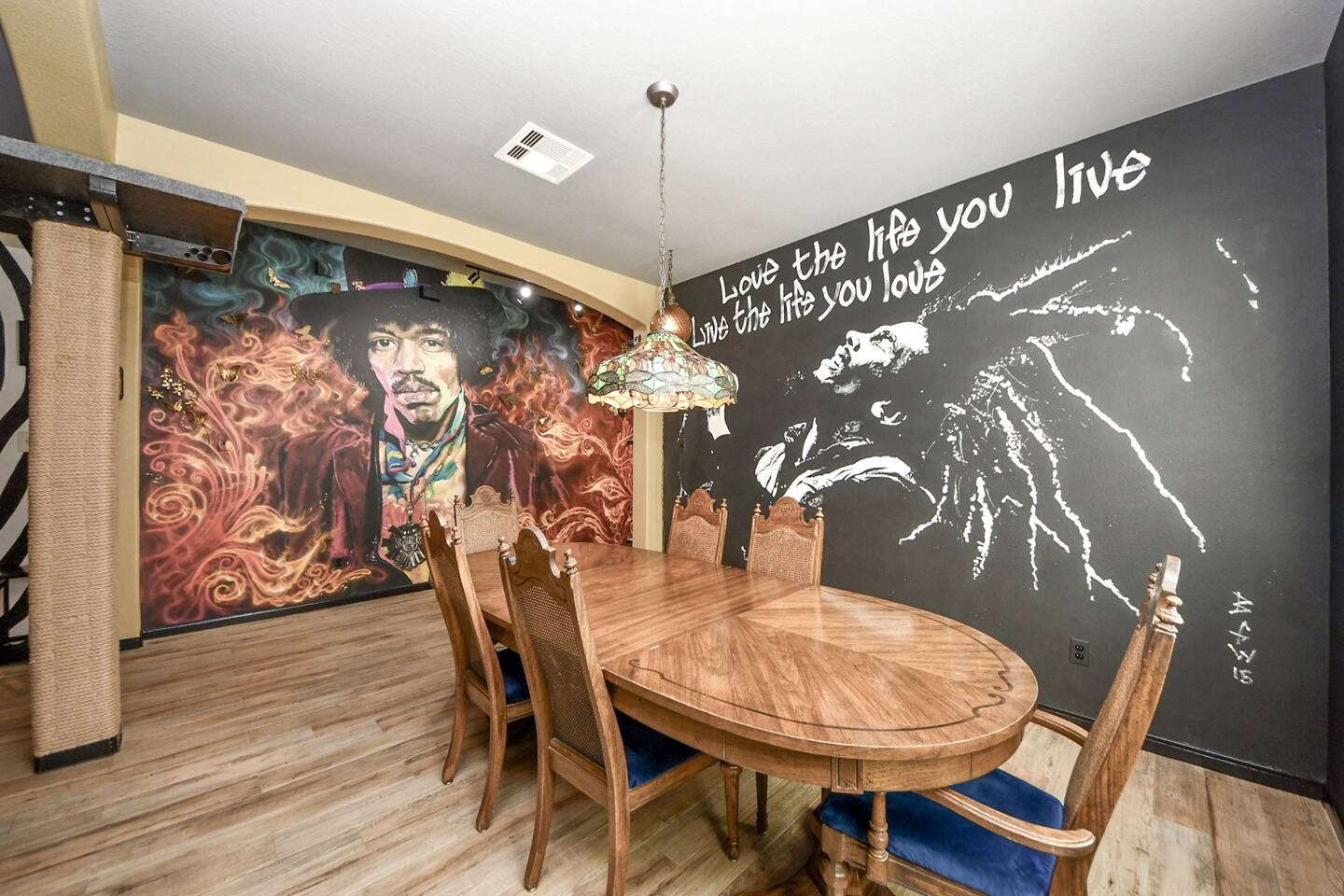 🎨 The Artistic Experience Each room offers a distinct atmosphere: • A geometric mural living room with oversized sectional seating • A serene forest-inspired primary bedroom • A playful and imaginative cartoon guest room • A bold dining space full of character with Jimmy Hendrix and Bob Marley in full size Because the murals are original artwork, this home appeals to guests who appreciate creativity, design, and staying somewhere truly unique. 🐱 Cat Friendly Stay This home welcomes cats and even includes a dedicated cat jungle for feline travelers. Please share pet details when booking so we can ensure a smooth stay. 🌿 Outdoor Garden The fenced backyard has been intentionally designed with native flowering plants that attract butterflies and seasonal blooms throughout the year. It’s a peaceful outdoor space for morning coffee or quiet evenings. 🛁 Spa-Style Primary Bath • Double vessel sinks • Modern floating vanity • Custom walk-in multi-jet shower • Freestanding soaking tub within the custom walk-in wet room, creating a spa-style retreat inside the primary bathroom Designed for relaxation after travel or long days exploring the area. 🍳 Kitchen (Fully Equipped) “Completely stocked kitchen with full-size appliances, gas range, cookware, and everything needed for preparing family meals or hosting a relaxed breakfast.” 🌅 Breakfast Nook (Sunrise Angle) “Sunlit breakfast table just off the kitchen — a favorite spot for morning coffee, casual meals, or slow hangouts while cooking.” 💻 Bedroom Workspace “Multiple bedrooms include dedicated desk space and closet storage, ideal for remote workers or guests staying longer than a weekend.” 🐱 Cat Jungle “Cat-friendly home featuring a dedicated cat jungle, making this a rare and welcoming option for guests traveling with feline companions. Home is thoroughly cleaned and ozone machine is run after pet reservations. “The home uses layered lighting, dimmers, salt lamps, and warm accent lighting to create a calm atmosphere that complements the artwork.”