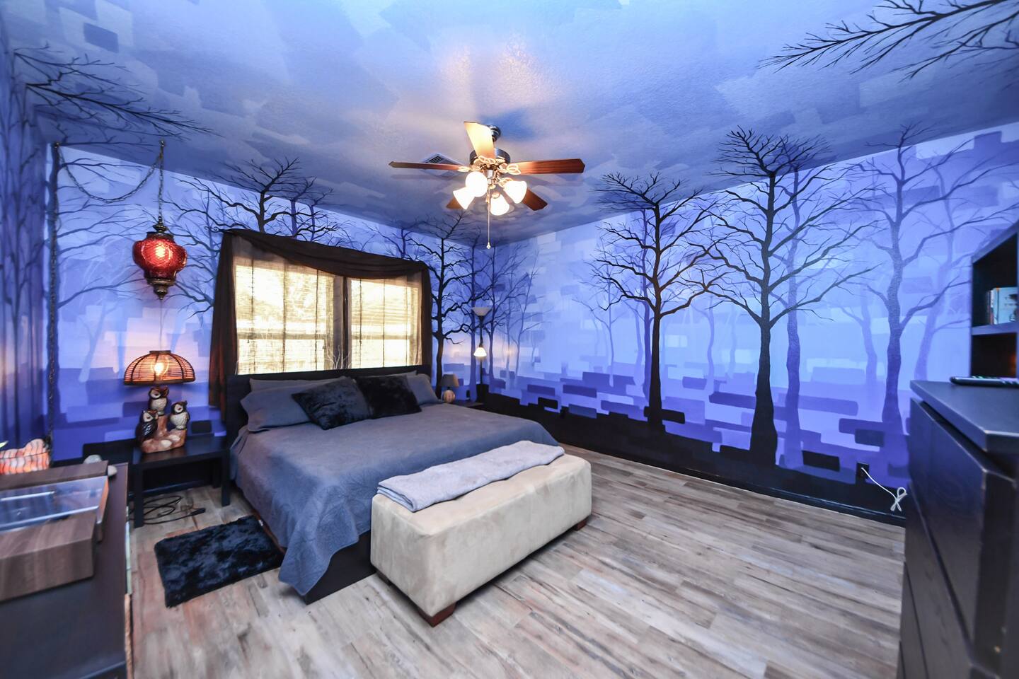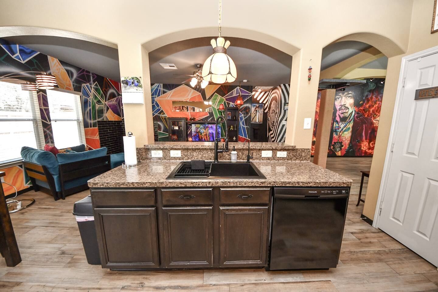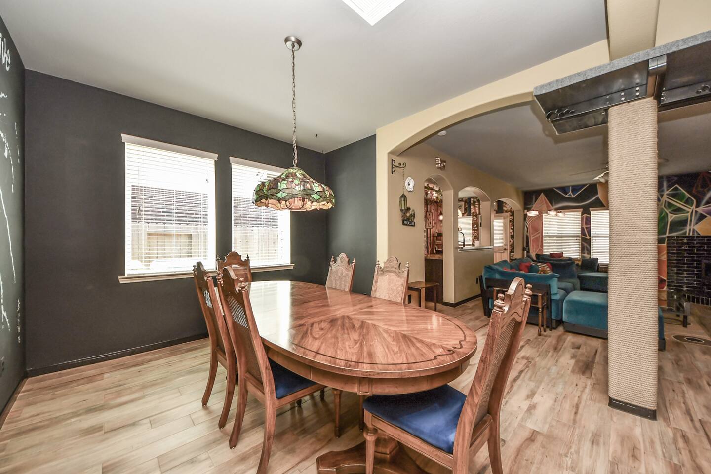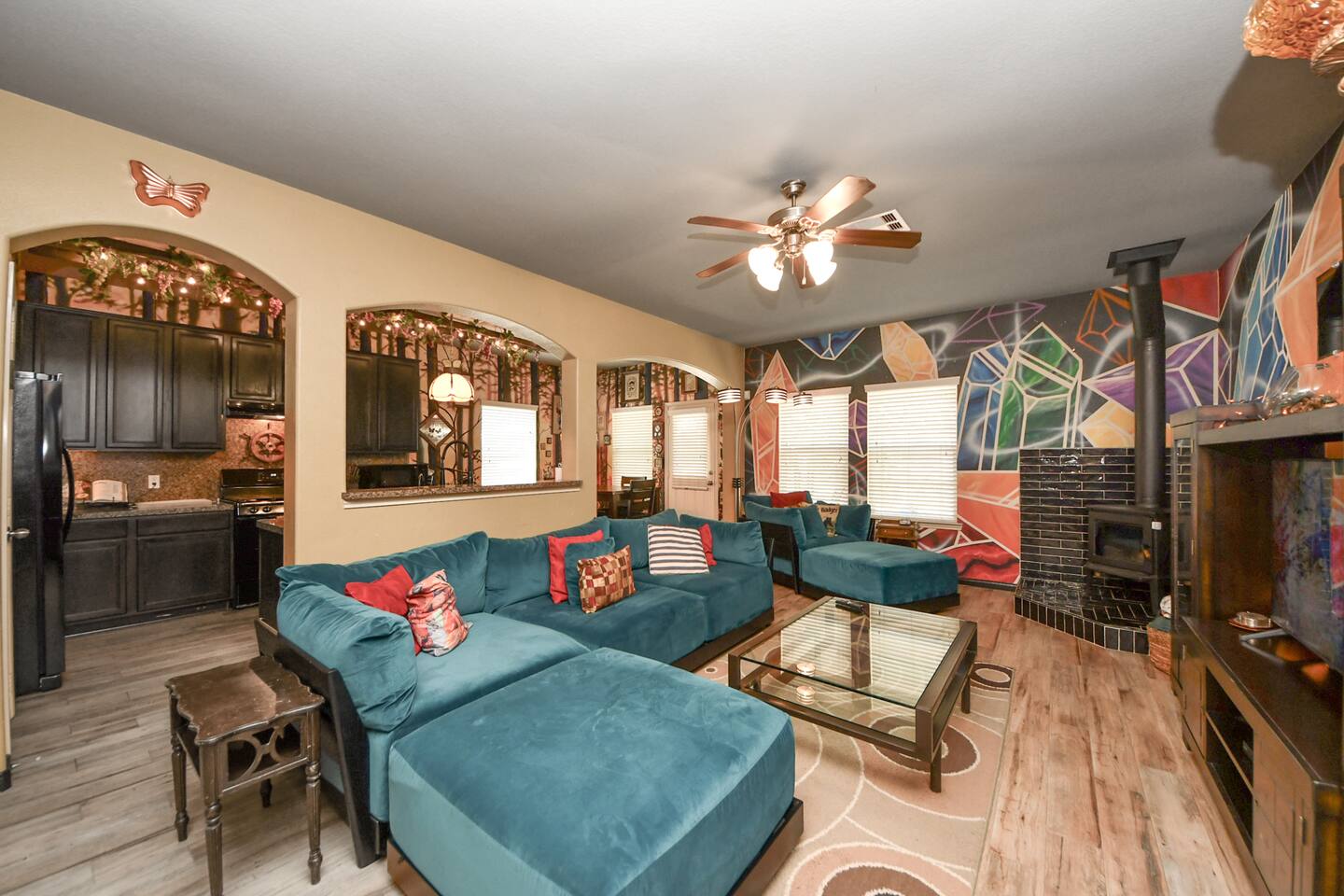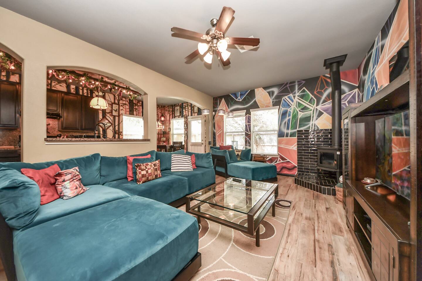 🎨 The Artistic Experience Each room offers a distinct atmosphere: • A geometric mural living room with oversized sectional seating • A serene forest-inspired primary bedroom • A playful and imaginative cartoon guest room • A bold dining space full of character with Jimmy Hendrix and Bob Marley in full size Because the murals are original artwork, this home appeals to guests who appreciate creativity, design, and staying somewhere truly unique. 🐱 Cat Friendly Stay This home welcomes cats and even includes a dedicated cat jungle for feline travelers. Please share pet details when booking so we can ensure a smooth stay. 🌿 Outdoor Garden The fenced backyard has been intentionally designed with native flowering plants that attract butterflies and seasonal blooms throughout the year. It’s a peaceful outdoor space for morning coffee or quiet evenings. 🛁 Spa-Style Primary Bath • Double vessel sinks • Modern floating vanity • Custom walk-in multi-jet shower • Freestanding soaking tub within the custom walk-in wet room, creating a spa-style retreat inside the primary bathroom Designed for relaxation after travel or long days exploring the area. 🍳 Kitchen (Fully Equipped) “Completely stocked kitchen with full-size appliances, gas range, cookware, and everything needed for preparing family meals or hosting a relaxed breakfast.” 🌅 Breakfast Nook (Sunrise Angle) “Sunlit breakfast table just off the kitchen — a favorite spot for morning coffee, casual meals, or slow hangouts while cooking.” 💻 Bedroom Workspace “Multiple bedrooms include dedicated desk space and closet storage, ideal for remote workers or guests staying longer than a weekend.” 🐱 Cat Jungle “Cat-friendly home featuring a dedicated cat jungle, making this a rare and welcoming option for guests traveling with feline companions. Home is thoroughly cleaned and ozone machine is run after pet reservations. “The home uses layered lighting, dimmers, salt lamps, and warm accent lighting to create a calm atmosphere that complements the artwork.”