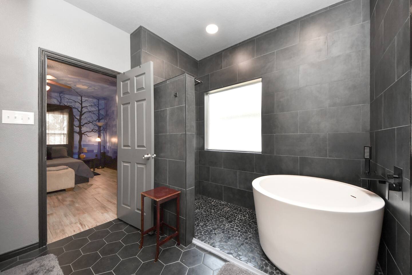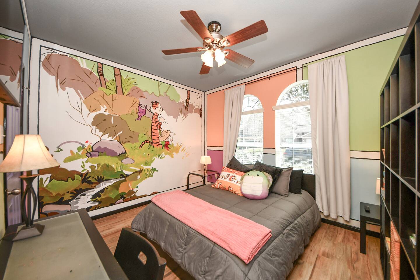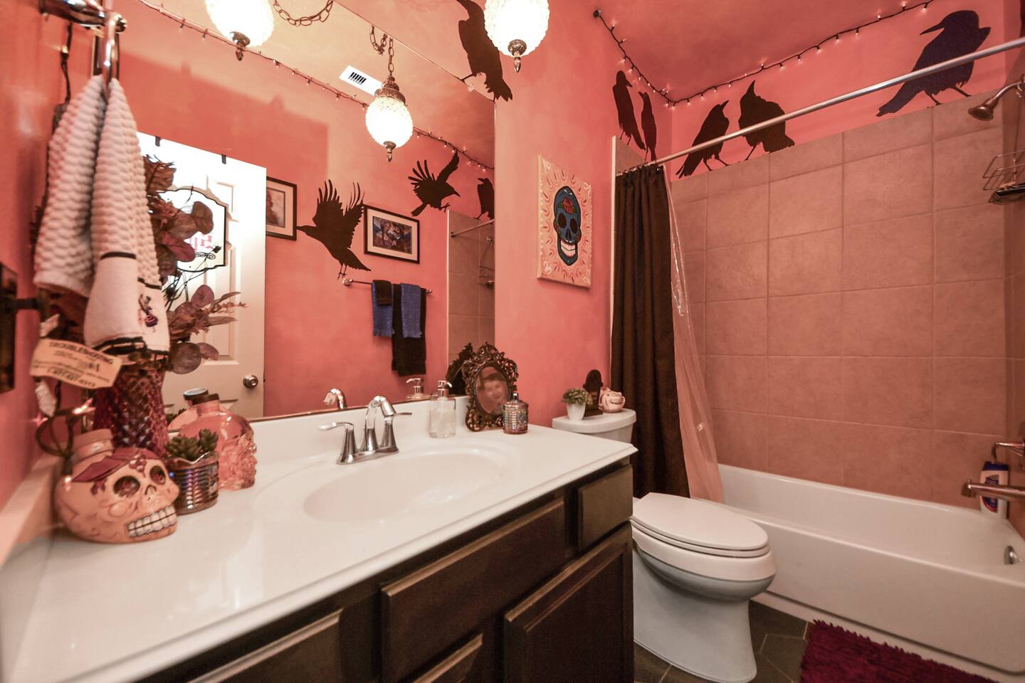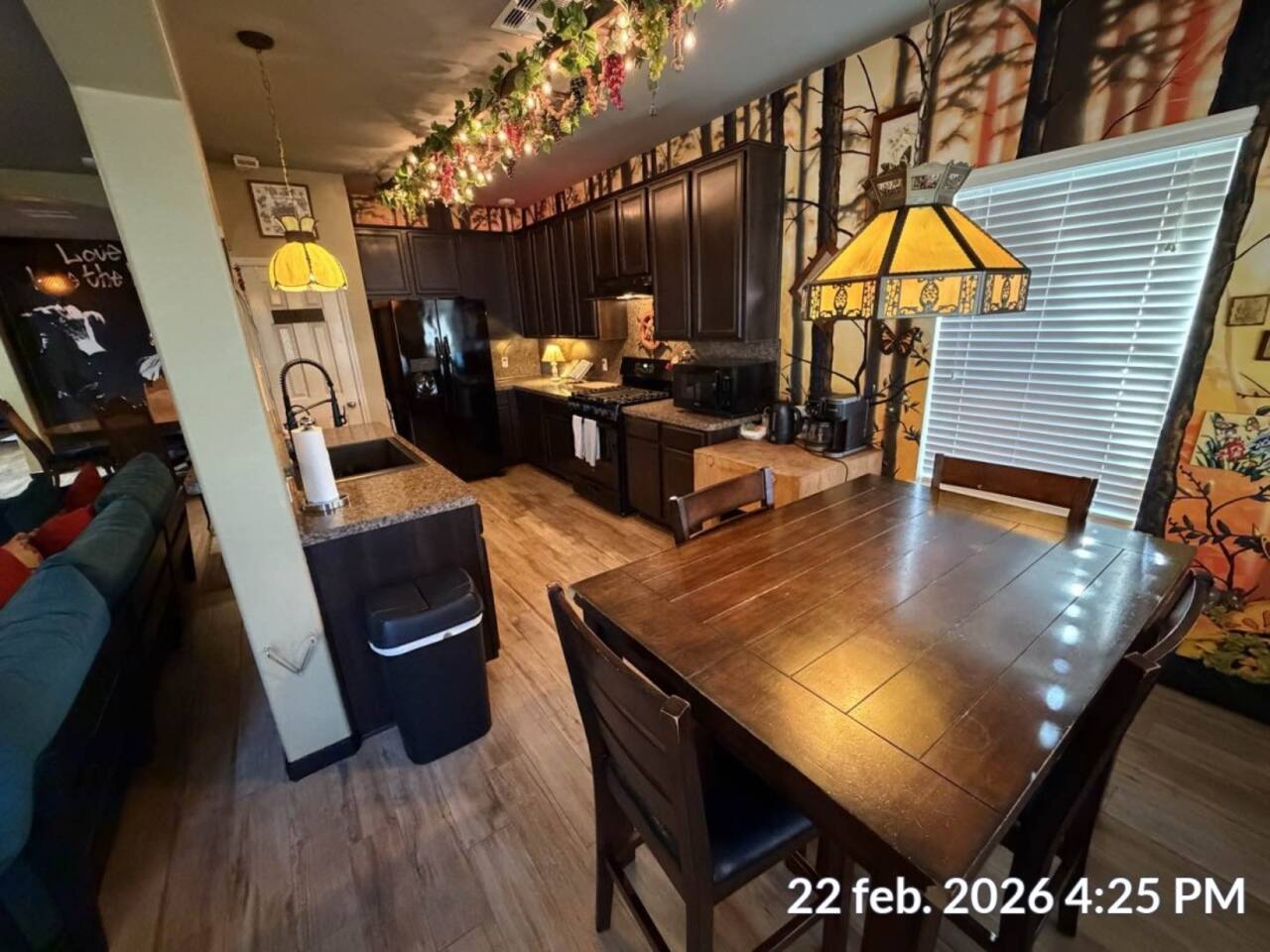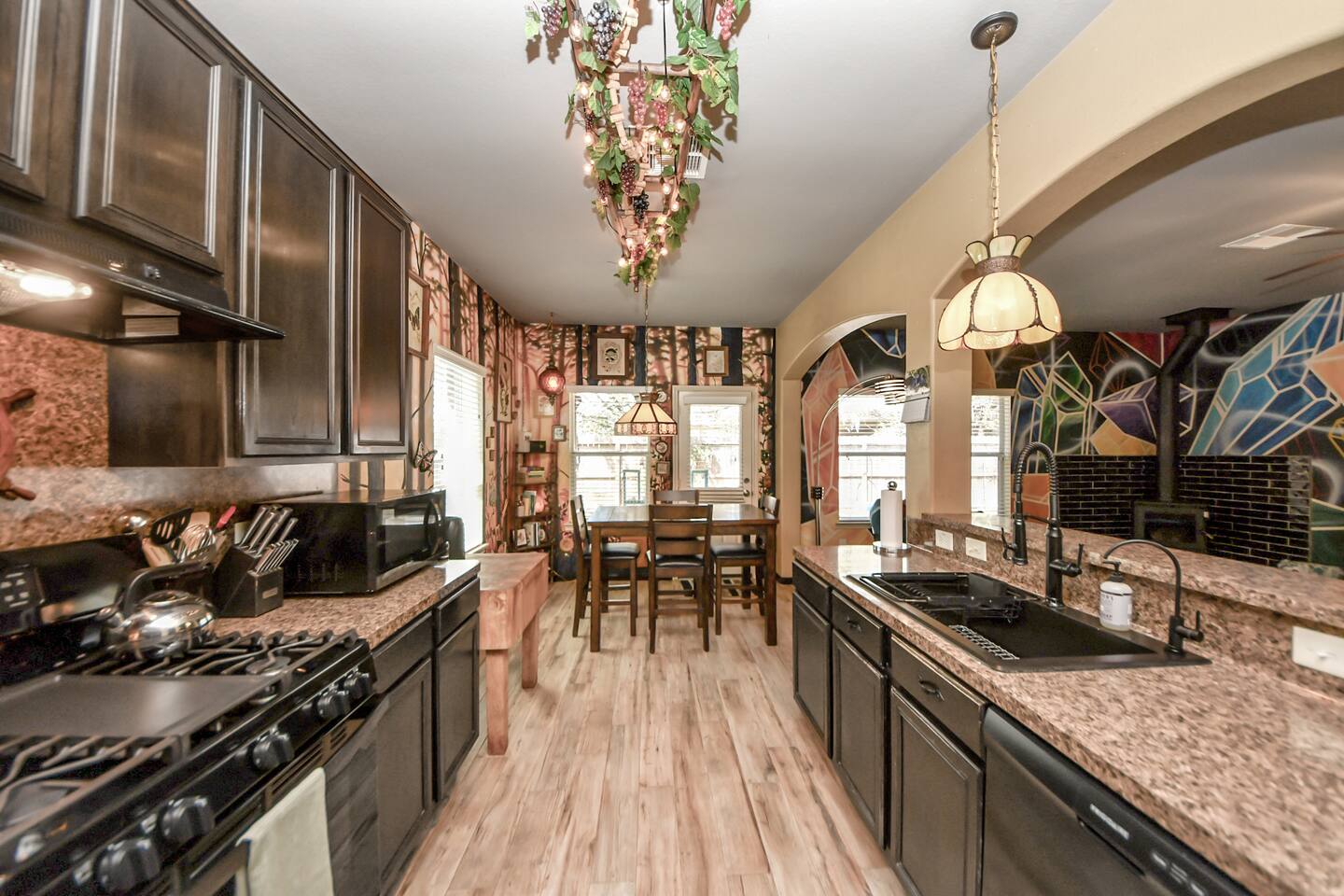 🎨 The Artistic Experience Each room offers a distinct atmosphere: • A geometric mural living room with oversized sectional seating • A serene forest-inspired primary bedroom • A playful and imaginative cartoon guest room • A bold dining space full of character with Jimmy Hendrix and Bob Marley in full size Because the murals are original artwork, this home appeals to guests who appreciate creativity, design, and staying somewhere truly unique. 🐱 Cat Friendly Stay This home welcomes cats and even includes a dedicated cat jungle for feline travelers. Please share pet details when booking so we can ensure a smooth stay. 🌿 Outdoor Garden The fenced backyard has been intentionally designed with native flowering plants that attract butterflies and seasonal blooms throughout the year. It’s a peaceful outdoor space for morning coffee or quiet evenings. 🛁 Spa-Style Primary Bath • Double vessel sinks • Modern floating vanity • Custom walk-in multi-jet shower • Freestanding soaking tub within the custom walk-in wet room, creating a spa-style retreat inside the primary bathroom Designed for relaxation after travel or long days exploring the area. 🍳 Kitchen (Fully Equipped) “Completely stocked kitchen with full-size appliances, gas range, cookware, and everything needed for preparing family meals or hosting a relaxed breakfast.” 🌅 Breakfast Nook (Sunrise Angle) “Sunlit breakfast table just off the kitchen — a favorite spot for morning coffee, casual meals, or slow hangouts while cooking.” 💻 Bedroom Workspace “Multiple bedrooms include dedicated desk space and closet storage, ideal for remote workers or guests staying longer than a weekend.” 🐱 Cat Jungle “Cat-friendly home featuring a dedicated cat jungle, making this a rare and welcoming option for guests traveling with feline companions. Home is thoroughly cleaned and ozone machine is run after pet reservations. “The home uses layered lighting, dimmers, salt lamps, and warm accent lighting to create a calm atmosphere that complements the artwork.”