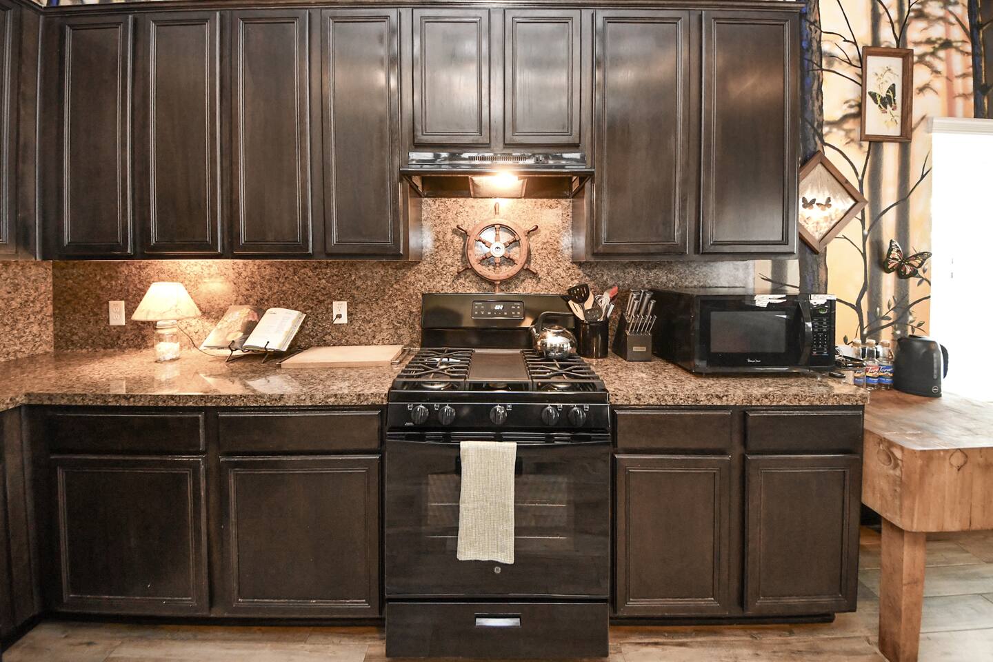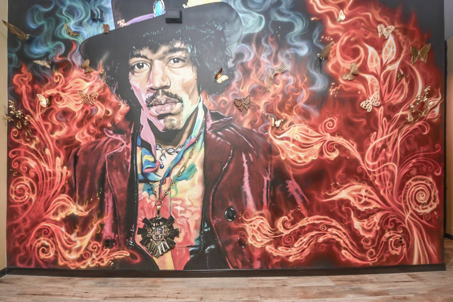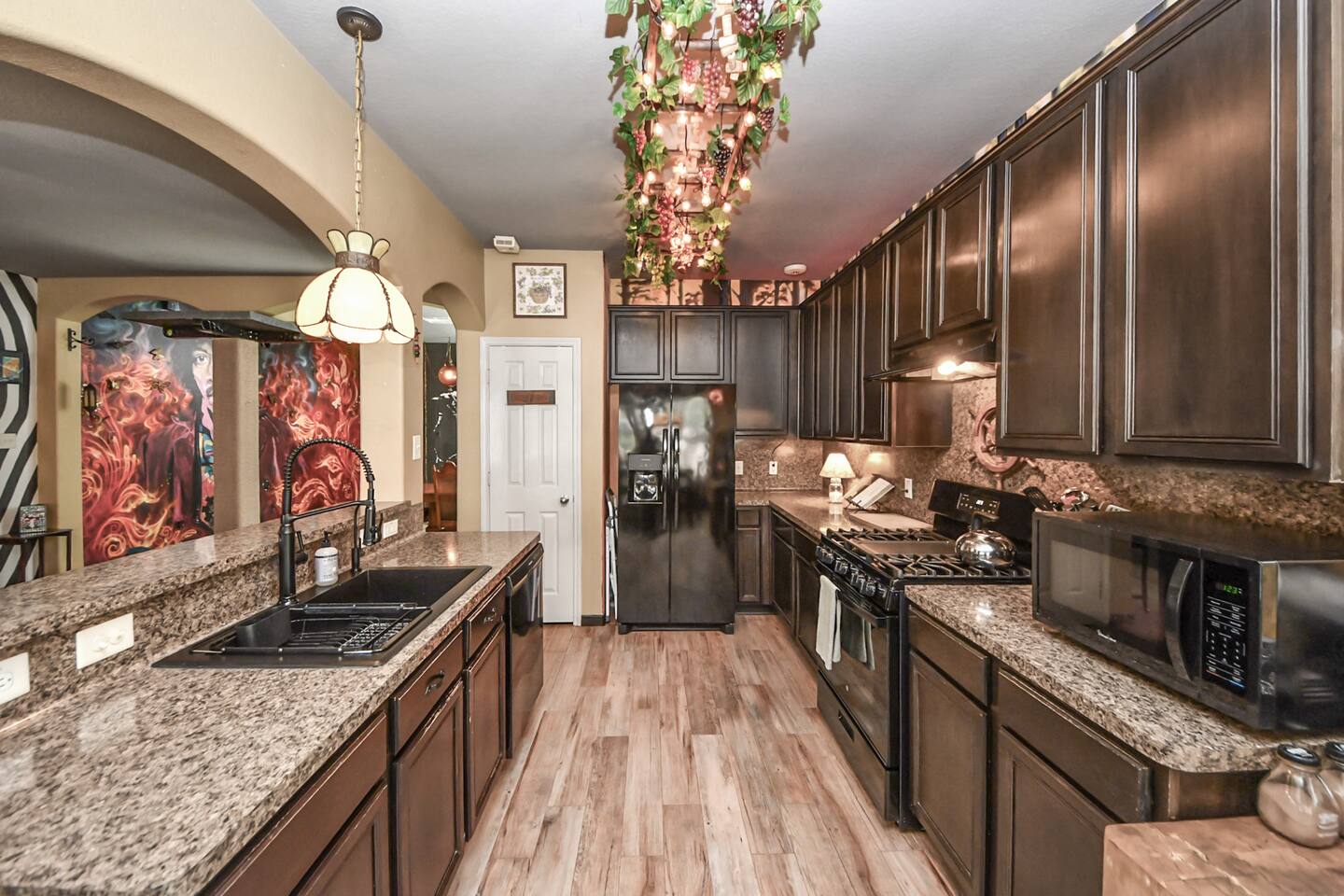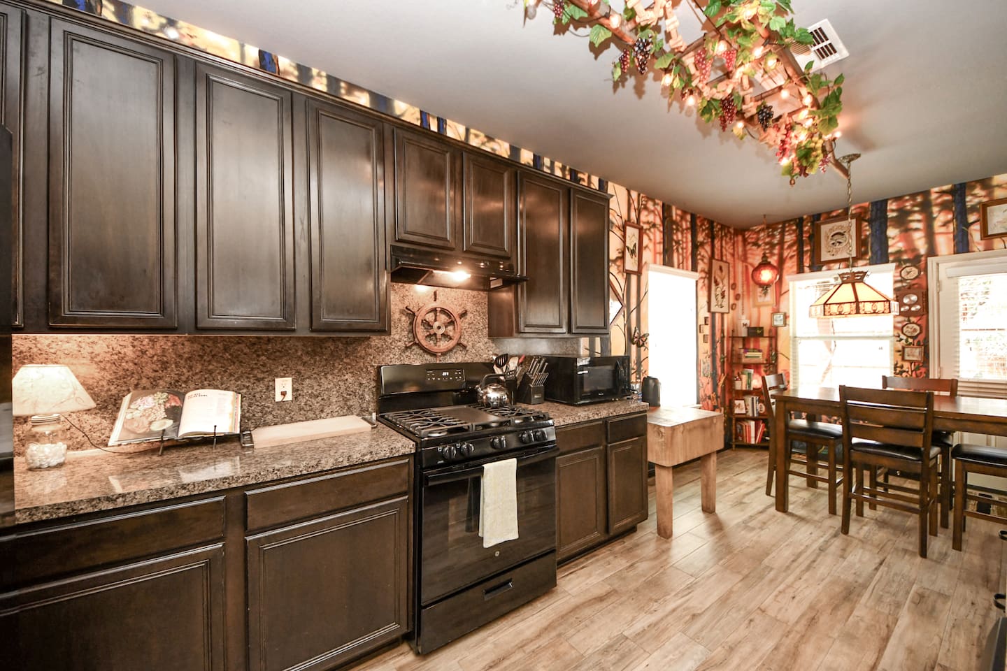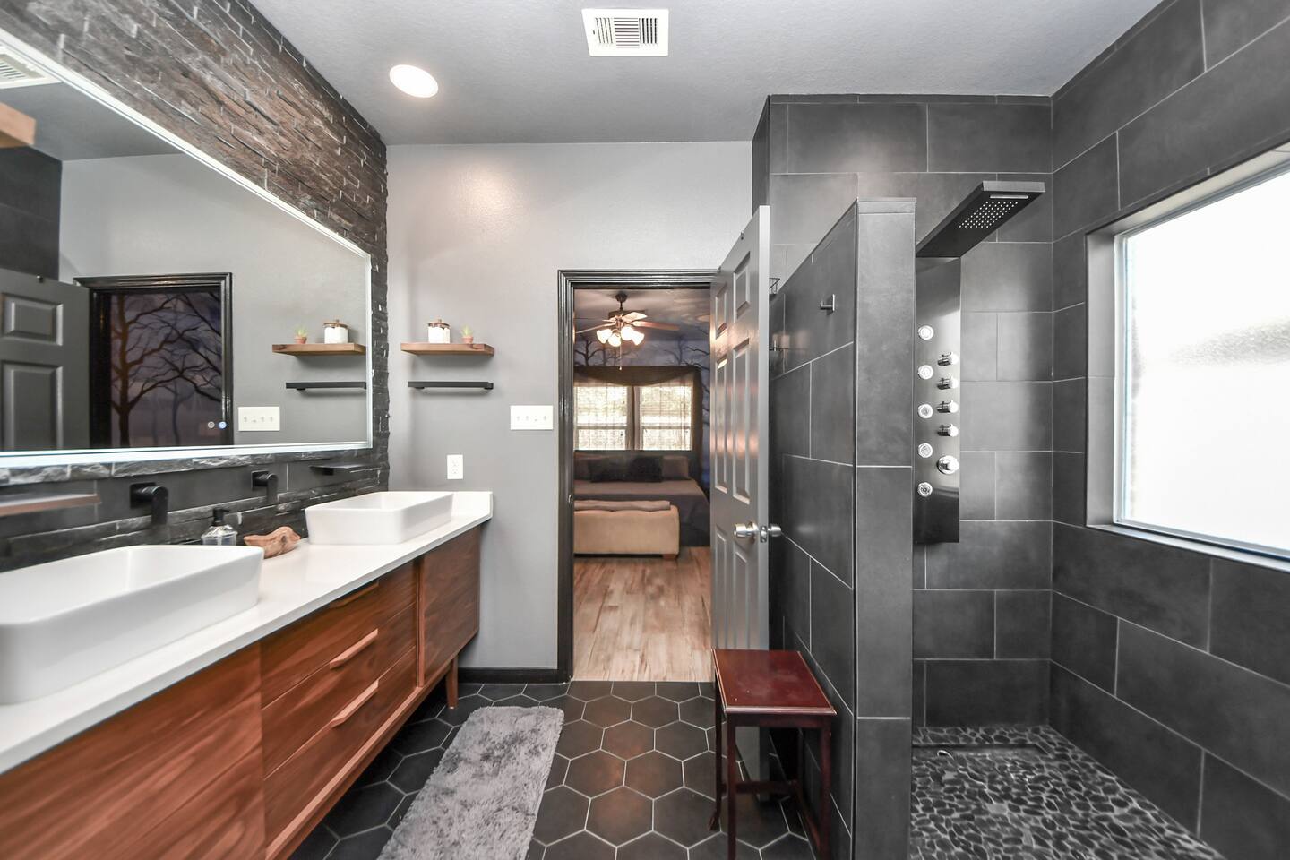 🎨 The Artistic Experience Each room offers a distinct atmosphere: • A geometric mural living room with oversized sectional seating • A serene forest-inspired primary bedroom • A playful and imaginative cartoon guest room • A bold dining space full of character with Jimmy Hendrix and Bob Marley in full size Because the murals are original artwork, this home appeals to guests who appreciate creativity, design, and staying somewhere truly unique. 🐱 Cat Friendly Stay This home welcomes cats and even includes a dedicated cat jungle for feline travelers. Please share pet details when booking so we can ensure a smooth stay. 🌿 Outdoor Garden The fenced backyard has been intentionally designed with native flowering plants that attract butterflies and seasonal blooms throughout the year. It’s a peaceful outdoor space for morning coffee or quiet evenings. 🛁 Spa-Style Primary Bath • Double vessel sinks • Modern floating vanity • Custom walk-in multi-jet shower • Freestanding soaking tub within the custom walk-in wet room, creating a spa-style retreat inside the primary bathroom Designed for relaxation after travel or long days exploring the area. 🍳 Kitchen (Fully Equipped) “Completely stocked kitchen with full-size appliances, gas range, cookware, and everything needed for preparing family meals or hosting a relaxed breakfast.” 🌅 Breakfast Nook (Sunrise Angle) “Sunlit breakfast table just off the kitchen — a favorite spot for morning coffee, casual meals, or slow hangouts while cooking.” 💻 Bedroom Workspace “Multiple bedrooms include dedicated desk space and closet storage, ideal for remote workers or guests staying longer than a weekend.” 🐱 Cat Jungle “Cat-friendly home featuring a dedicated cat jungle, making this a rare and welcoming option for guests traveling with feline companions. Home is thoroughly cleaned and ozone machine is run after pet reservations. “The home uses layered lighting, dimmers, salt lamps, and warm accent lighting to create a calm atmosphere that complements the artwork.”