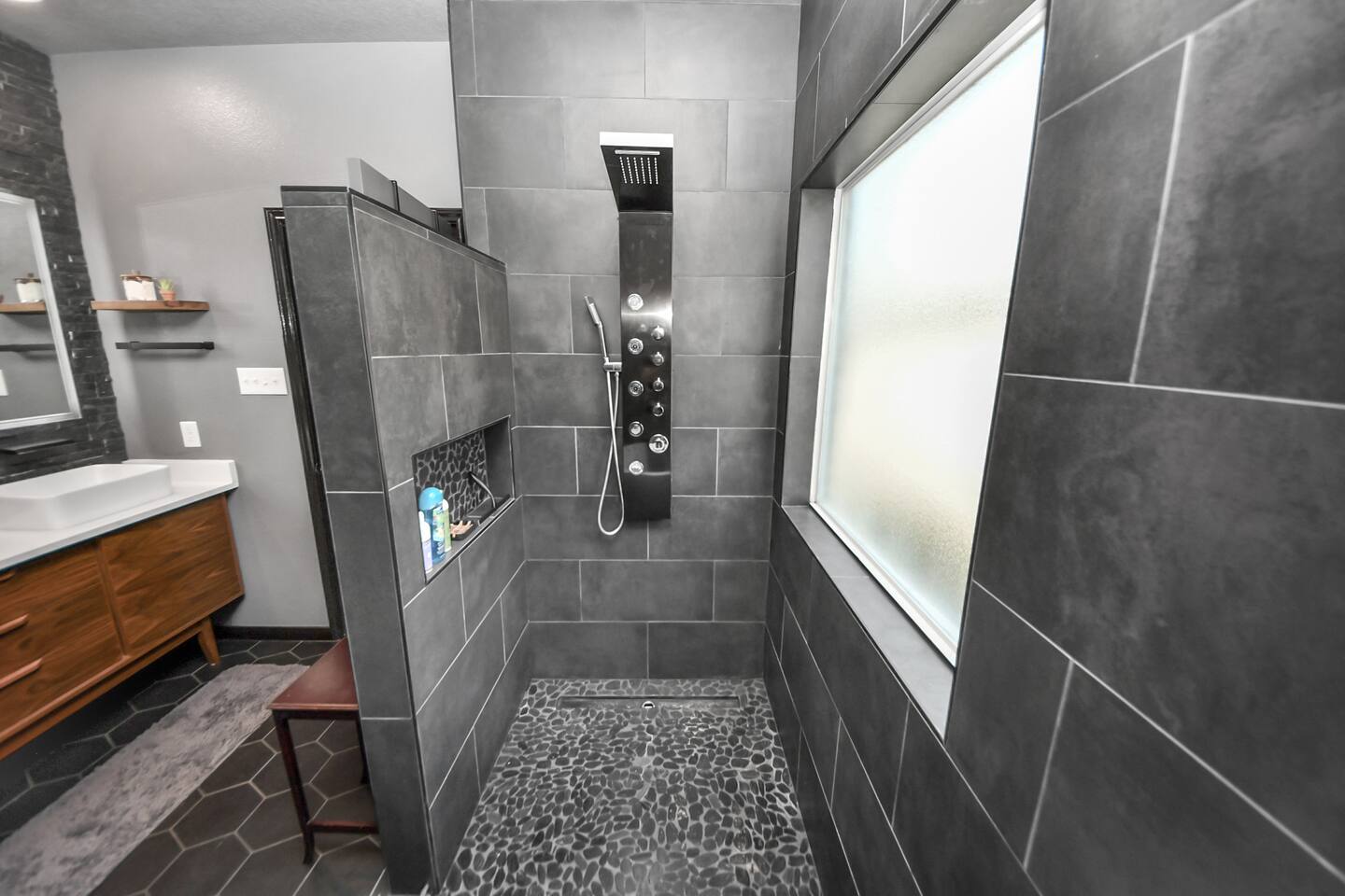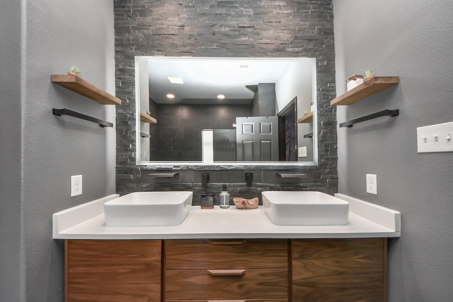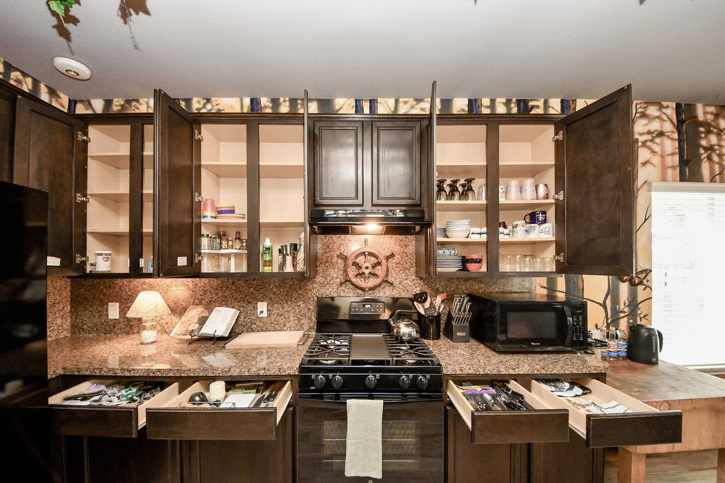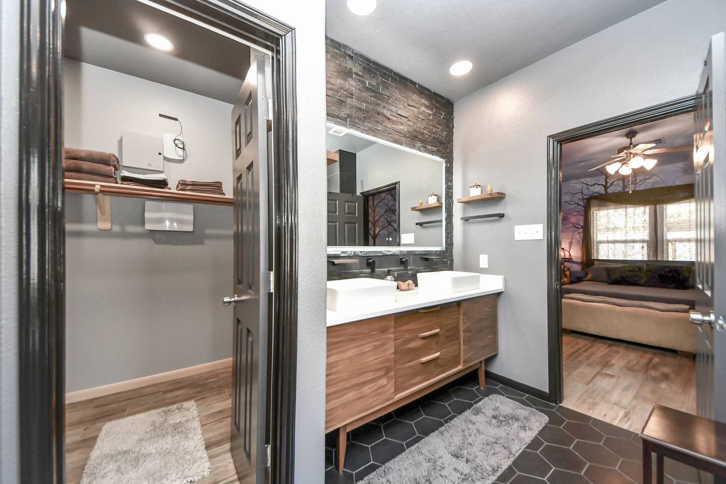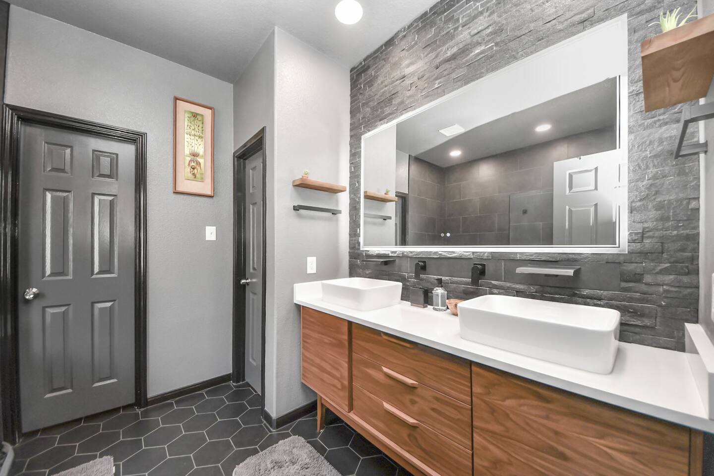 🎨 The Artistic Experience Each room offers a distinct atmosphere: • A geometric mural living room with oversized sectional seating • A serene forest-inspired primary bedroom • A playful and imaginative cartoon guest room • A bold dining space full of character with Jimmy Hendrix and Bob Marley in full size Because the murals are original artwork, this home appeals to guests who appreciate creativity, design, and staying somewhere truly unique. 🐱 Cat Friendly Stay This home welcomes cats and even includes a dedicated cat jungle for feline travelers. Please share pet details when booking so we can ensure a smooth stay. 🌿 Outdoor Garden The fenced backyard has been intentionally designed with native flowering plants that attract butterflies and seasonal blooms throughout the year. It’s a peaceful outdoor space for morning coffee or quiet evenings. 🛁 Spa-Style Primary Bath • Double vessel sinks • Modern floating vanity • Custom walk-in multi-jet shower • Freestanding soaking tub within the custom walk-in wet room, creating a spa-style retreat inside the primary bathroom Designed for relaxation after travel or long days exploring the area. 🍳 Kitchen (Fully Equipped) “Completely stocked kitchen with full-size appliances, gas range, cookware, and everything needed for preparing family meals or hosting a relaxed breakfast.” 🌅 Breakfast Nook (Sunrise Angle) “Sunlit breakfast table just off the kitchen — a favorite spot for morning coffee, casual meals, or slow hangouts while cooking.” 💻 Bedroom Workspace “Multiple bedrooms include dedicated desk space and closet storage, ideal for remote workers or guests staying longer than a weekend.” 🐱 Cat Jungle “Cat-friendly home featuring a dedicated cat jungle, making this a rare and welcoming option for guests traveling with feline companions. Home is thoroughly cleaned and ozone machine is run after pet reservations. “The home uses layered lighting, dimmers, salt lamps, and warm accent lighting to create a calm atmosphere that complements the artwork.”
